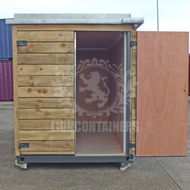 The smaller of the two custom built units was 10ft x 5ft 10″ x 6ft 10″. The internal walls, roof and cargo doors were lined with 12mm ply which was placed over glass/wool insulation and a timber stud frame. The client wanted to create a living roof, so we installed a galvanised roof top tray which covered the full roof area, a drip chain was fitted. A custom built hinged door frame was installed in the 5ft side wall, this had shoot bolts to the top and bottom of the inside left hand door, and a slim line lockbox was fitted. The units exterior (including the door) was externally clad with 145mm x 22mm tanalised larch cladding, with a 10mm shadow gap.